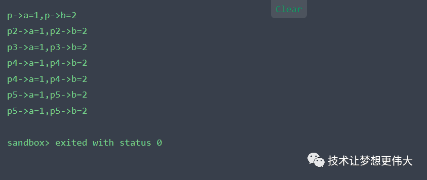 printf("p5->a=%d,p5->b=%dn",p5->a,p5->b);
