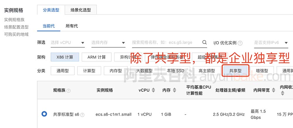 阿里云ECS共享型云服务器有共享型S6、共享型n4、突发性能型t6/t5、共享型mn4、xn4、e4,除了这几款共享型云服务器规格,剩下的都是企业级独享型云服务器。如ECS计算型c6、通用型g7、内存型r7、大数据型、GPU型等等均是独享型云服务器。