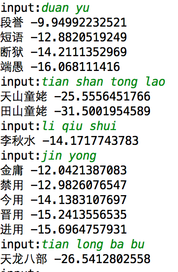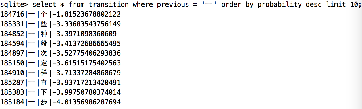 此处用到的是最简单的一阶隐马尔科夫模型,即认为在一个句子里,每个汉字的出现只和它前面的的一个汉字有关,虽然简单粗暴,但已经可以满足大部分情况。统计的过程就是找出字典中每个汉字后面出现的汉字集合,并统计概率。因为这个概率矩阵非常的大,逐条数据写入数据库过慢,后续可以优化为批量写入,提高训练效率。结果如下: