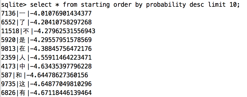 统计初始化概率矩阵,就是找出所有出现在词首的汉字,并统计它们出现在词首的次数,最后根据上述数据算出这些汉字出现在词首的概率,没统计的汉字就认为出现在词首的概率是0,不写入数据库。有一点注意的是为了防止概率计算的时候因为越算越小导致计算机无法比较,所有的概率都进行了自然对数运算。统计的结果如下: