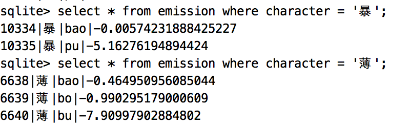 代码见model/table.py文件,针对隐马尔科夫的三个概率矩阵,分别设计了三个数据表存储。这样的好处很明显,汉字的转移概率矩阵是一个非常大的稀疏矩阵,直接文件存储占用空间很大,并且加载的时候也只能一次性读入内存,不仅内存占用高而且加载速度慢。此外数据库的join操作非常方便viterbi算法中的概率计算。