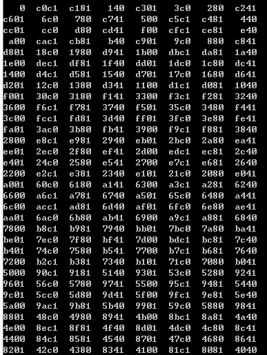 以3.3.3中的CRC16代码为例,首先生成一个表,此表每个元素都是2字节,一共256个元素。但是需要将这个表拆分成两个表,其中高字节放在crcLowTable,低字节放在crcHighTable(我也不理解为什么这样做,但是按照这样的方法确实能实现查表法)。生成表代码如下: