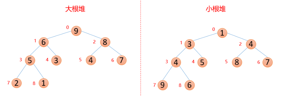 n个关键字序列List[1,2,3...N]称为堆(后面简写为L),物理结构可以是顺序存储也可以是链式存储(在例子中我们统一使用顺序存储结构),逻辑结构则是完全二叉树(要具有抽象思想),堆又分为大根堆和小根堆。