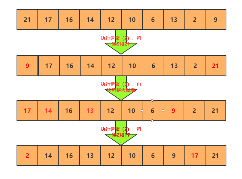完成了第(1)步,构造成了一个大根堆,但是我们排序并没有完成,其实也可以说完成了,因为从大根堆的角度来说已经排序好了,但是从顺序数据结构来说,仍然是无序的。