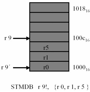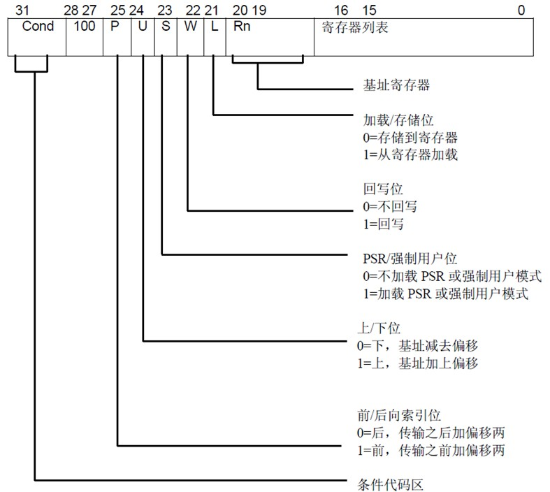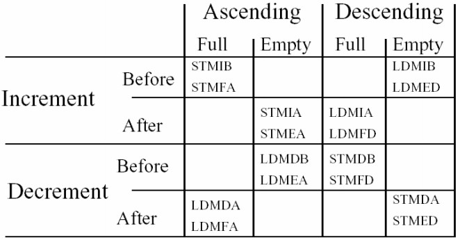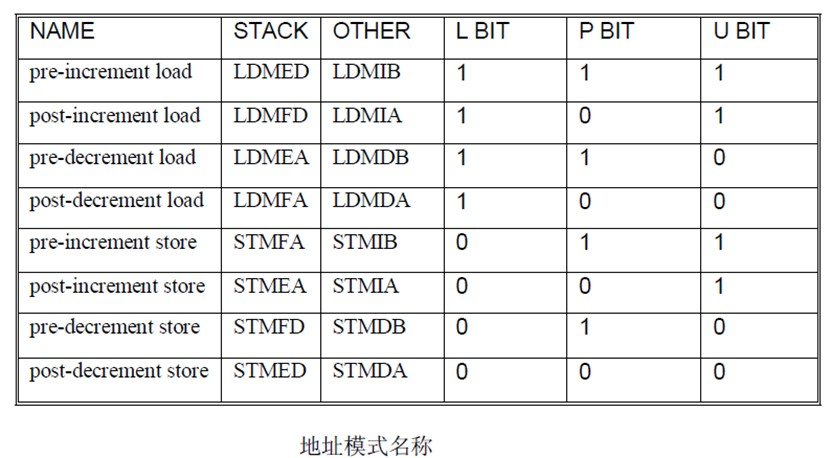 当LDM/STM没有被用于堆栈,而只是简单地表示地址前向增加,后向增加,前向减少,后向减少时,由IA,IB,DA,DB控制。