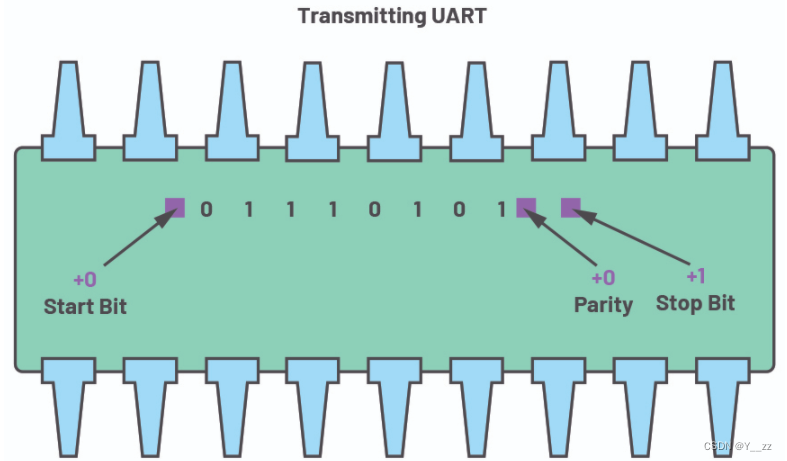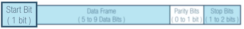 当不传输数据时,UART数据传输线通常保持高电压电平。若要开始数据传输,发送UART会将传输线从高电平拉到低电平并保持1个时钟周期。当接收UART检测到高到低电压跃迁时,便开始以波特率对应的频率读取数据帧中的位。