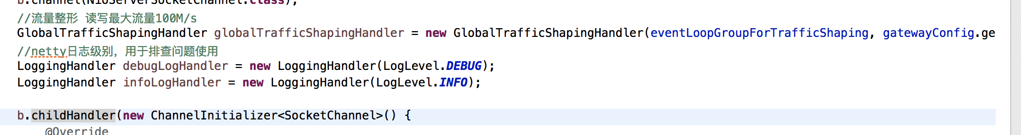 本次工程按照处理几十万机器链接的要求构建的,需要对流量做控制。netty提供通道级别流量整形、及全局流量整形的流量控制支持,我司选择全局的流量负载。问过我司运维单机最大流量负载是读写各100M。故netty全局流量负载读写设置为100M。自贩机目前单机读写流量负载为11M左右,也就是说单机要20倍自贩机规模才能触发此设置。