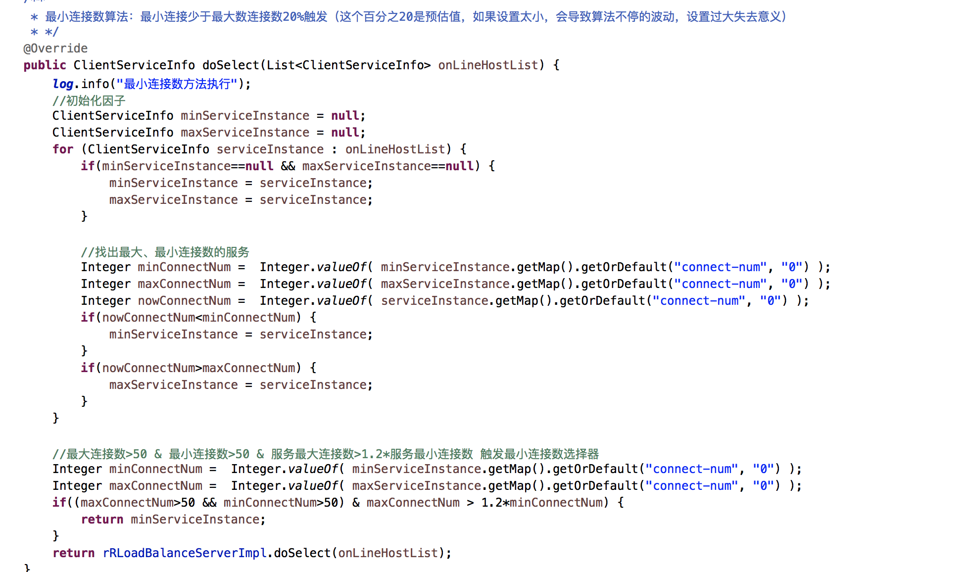 通过获取在线的服务节点上的长链接数,如果链接最多的节点的链接数比最少的多20%则触发控制。链接全部给最少的节点,等节点链接数在水位内,自动关闭链接最少算法,路由走RR算法。