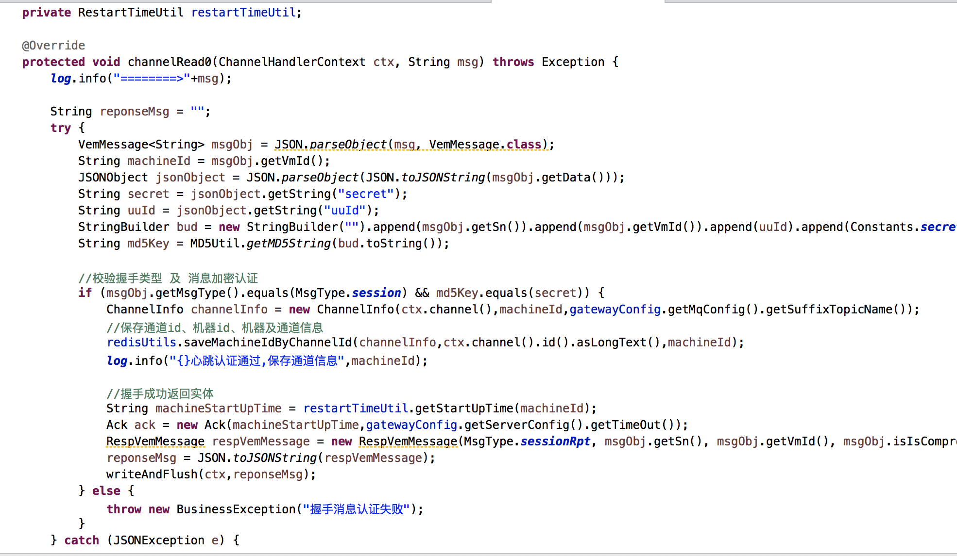 自贩机握手校验是每次发送一个消息都校验消息是否合法,验证的方法是读redis的认证缓存token,但是netty有更优雅的方式解决。netty在第一次通讯的时候会拦截该消息,如果验证通过netty会删除验证消息的handler具体代码:ctx.pipeline().remove(this),后续这个通道的消息不需要再次验证。
