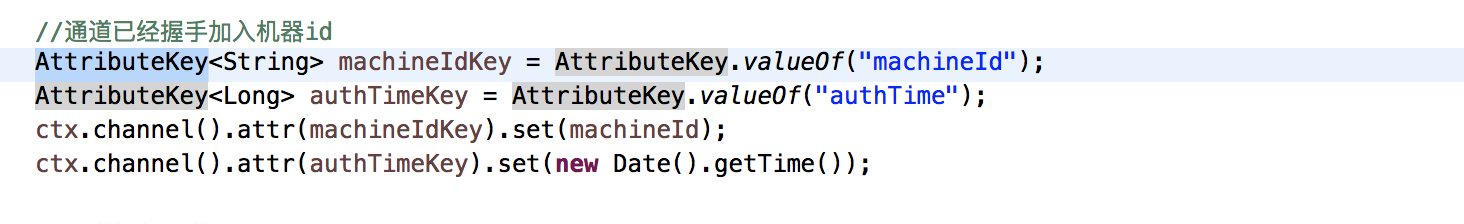 netty 通道识别是通过ChannelId识别的。Channeld支持两类asShortText(可能重复)、asLongText(全局唯一)两类。我们设备就是映射为唯一的一个ChannelId。但是ChannelId不好管理没有对应的业务标记,所以我们要利用Channel的AttributeKey属性绑定业务工控机vemId。这个api比较特殊文档描述不是很清楚一般刚入门netty的人不会发现这个特性。