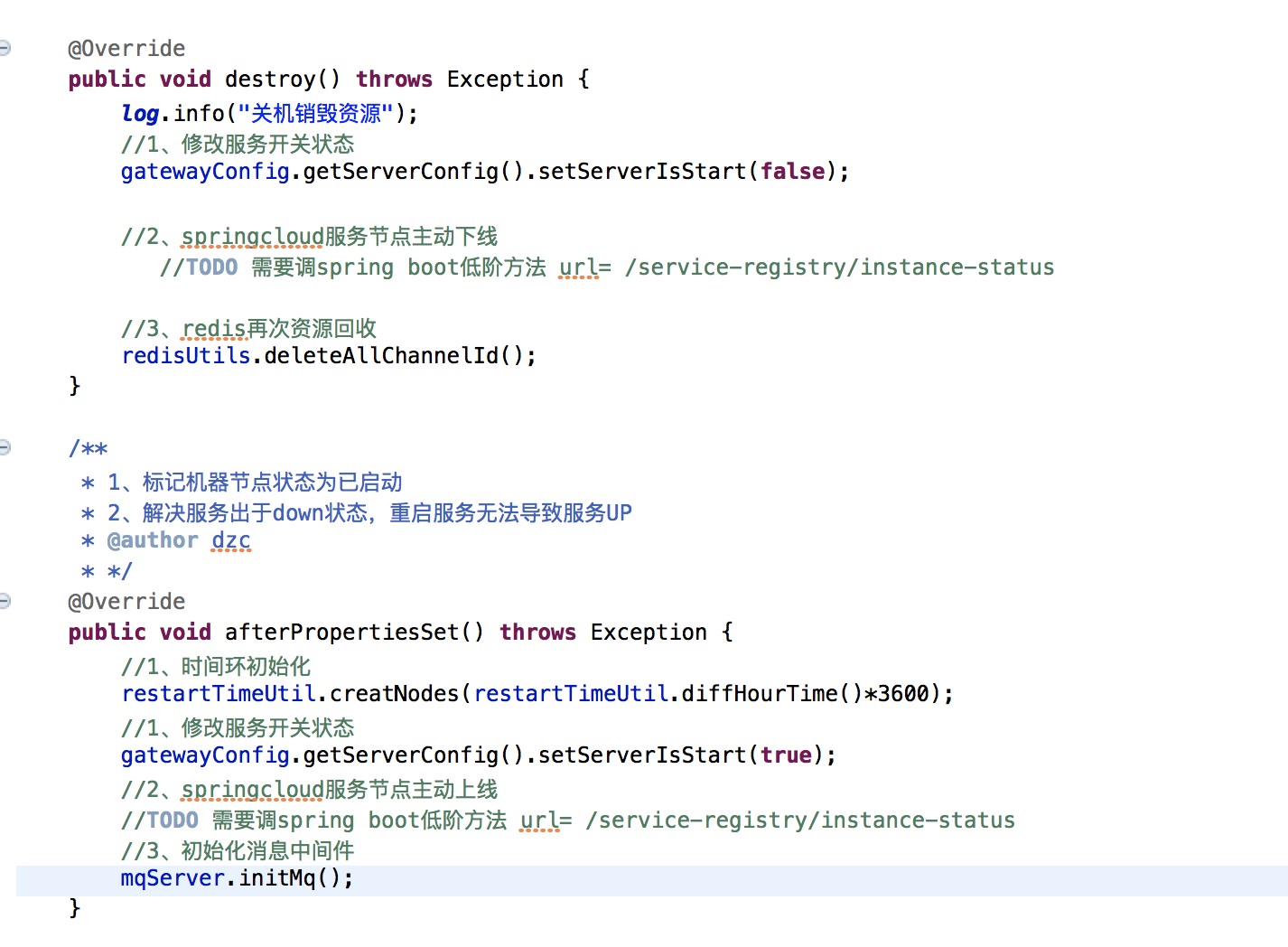 springcloud服务上线up操作:测试和生产发现有springcloud服务出于down状态,重启项目服务依然是down状态。原因是因为服务处于down状态,重启后运维脚本没有up。咨询运维后发现是邱小泉这边决定的规则。这边为了规避这个问题自己UP自己上线。