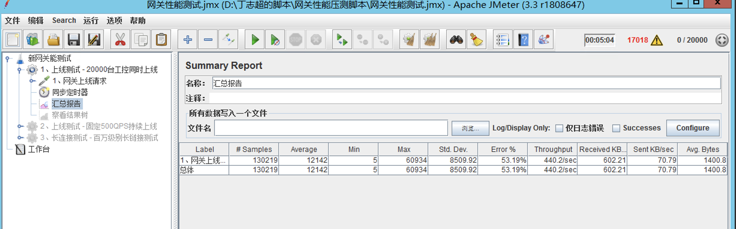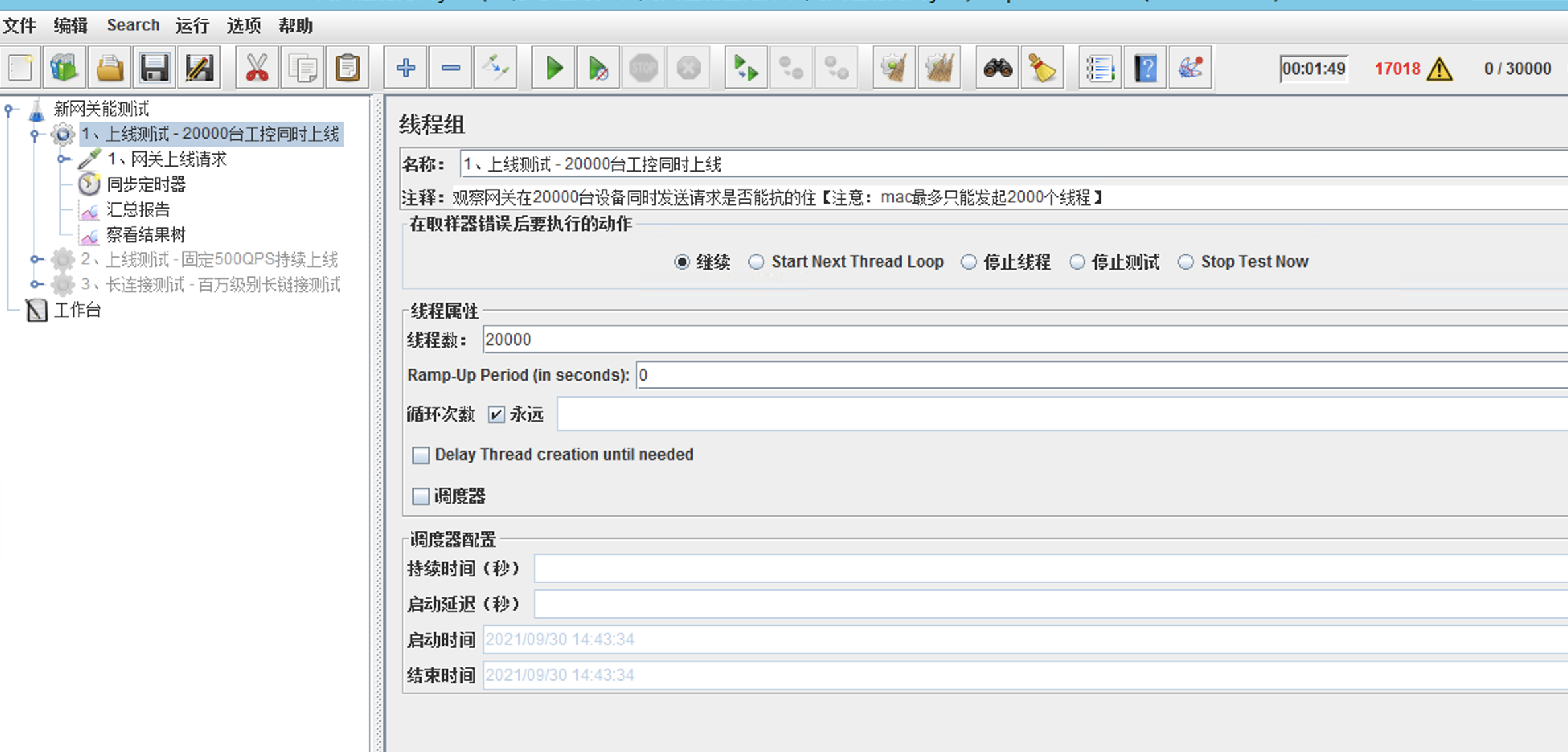 1、用jemter模拟出20000个工控等线程初始化就绪一次性访问网关,为什么不更多?jemter集群资源性能不够。