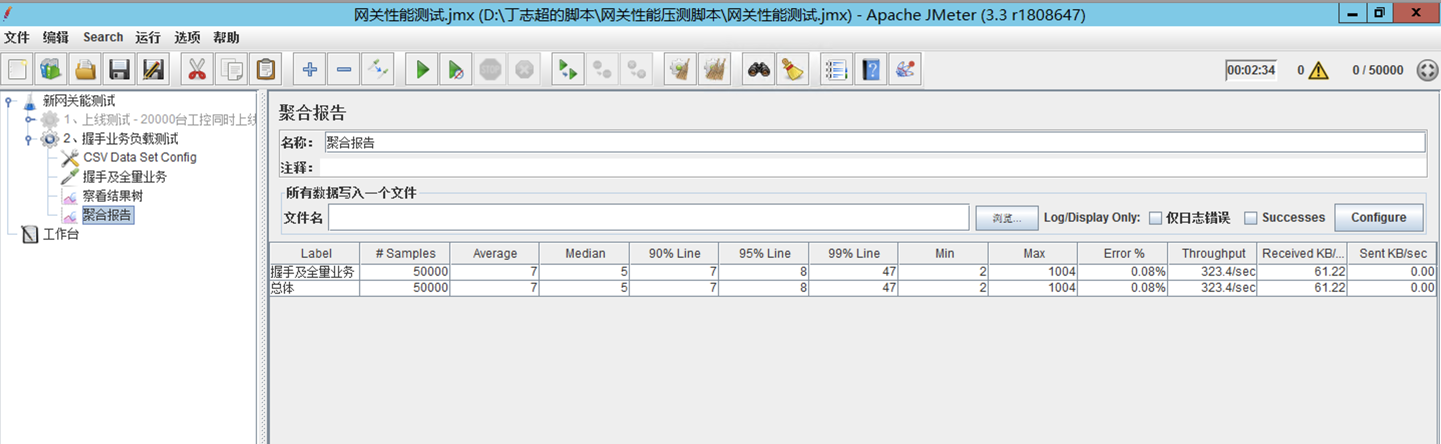 1、用jemter模拟出50000个工控,上线后发送业务协议,然后观察网关系统负载。