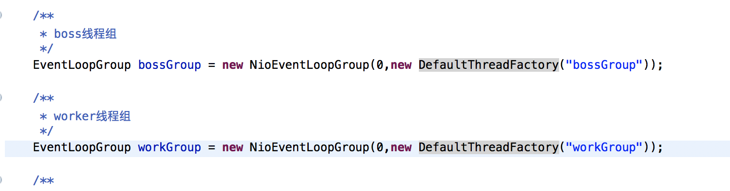使用netty提供的默认线程池管理类DefaultThreadFactory实现对boss、worker线程池管理。好处线程池中线程数由netty自己管理比我们自己决定更科学、线程名称、线程组统一管理在排异常更友好。