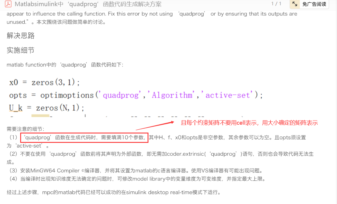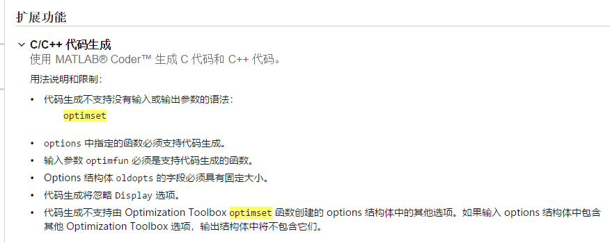 编译代码时 遇到“‘cell2mat’及'quadprog' ‘optimset’is not supported for code generation”的问题,这是因为MATLAB自己封装的函数是不支持C++代码生成的,需要将其定义为外部函数,即使用coder.extrinsic声明一下。并且: