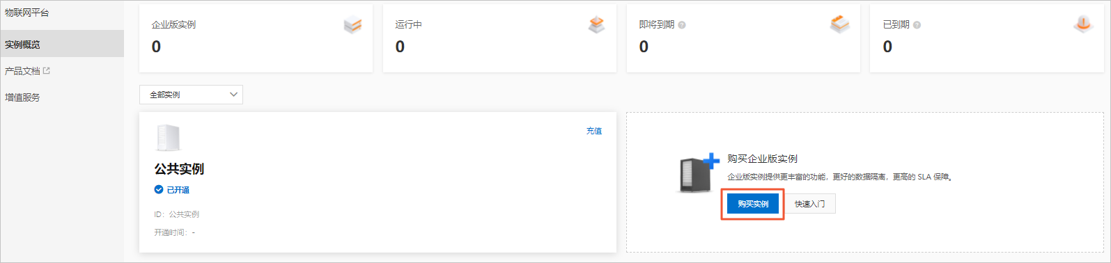 - 在实例概览页面的购买企业版实例卡片中,单击购买实例。
