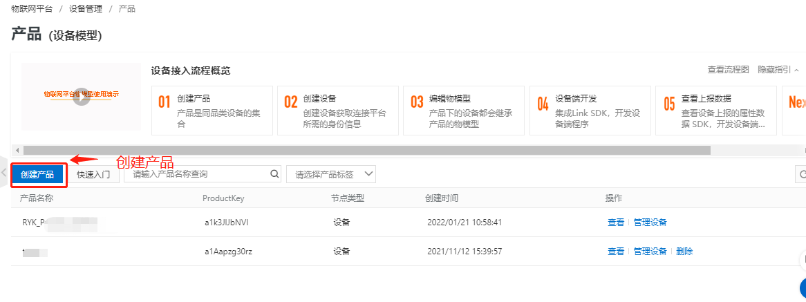 第二步,创建产品和设备