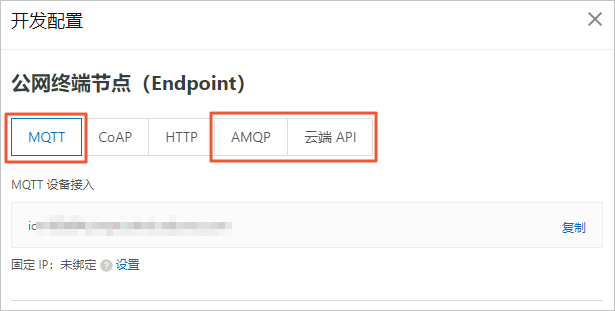 本文示例以公网环境为例,您需复制并保存MQTT、AMQP和云端API的接入信息,用于后续实现设备接入、服务端订阅消息和云端下发指令功能。