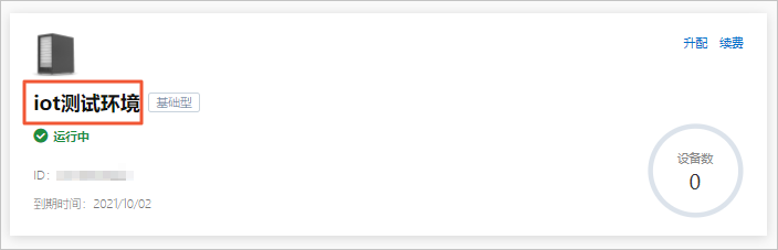 - 在物联网平台控制台的实例概览页面,单击实例iot测试环境。