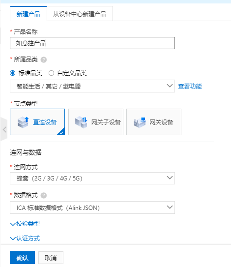 本文示例的产品名称为家庭温控器,所属品类为自定义品类,其他参数使用默认值,如下图所示。