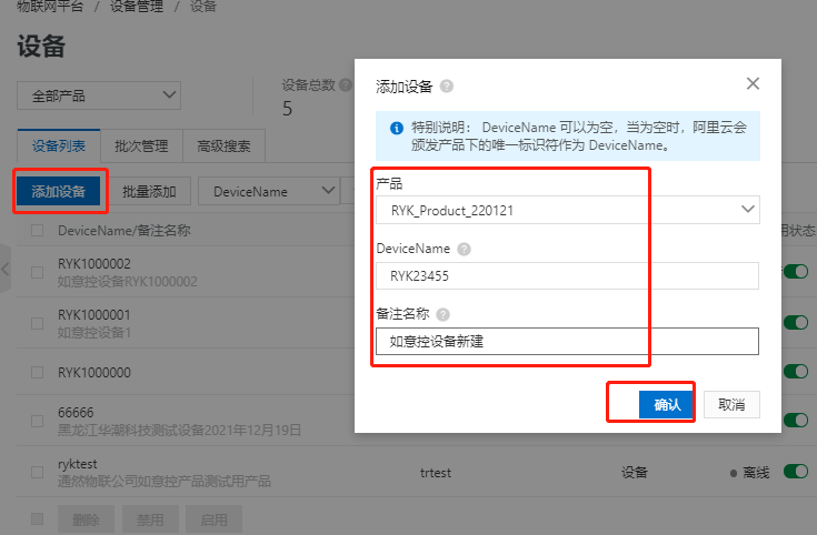 在设备列表页签,单击添加设备,在弹出对话框中,输入设备名称(例如Device1),单击确认。