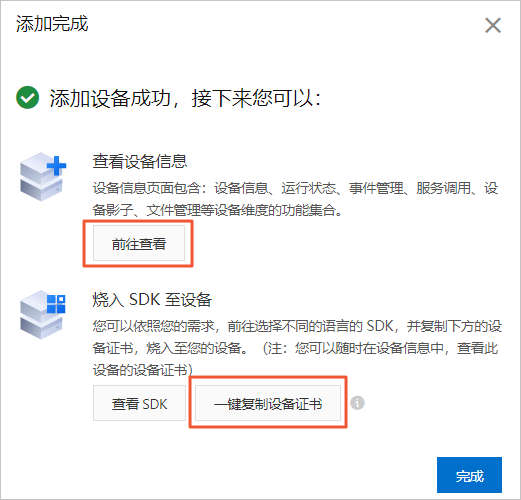 创建设备成功后,在弹出的添加完成对话框,单击一键复制设备证书获取设备证书。您也可单击前往查看,在设备详情页面,单击DeviceSecret右侧查看,获取设备证书。