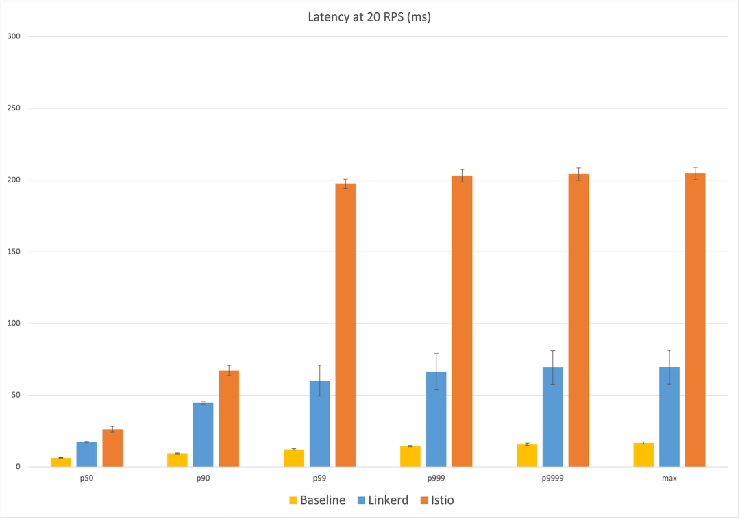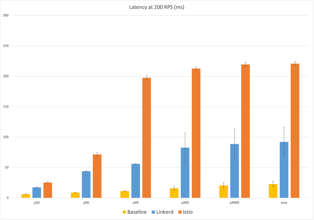 我们的实验结果如下图所示,图中的每个点都是五次运行的平均值,误差线代表该平均值的一个标准差。柱状图本身代表 Linkerd(蓝色)、Istio(橙色)和无服务网格的基线(黄色)。