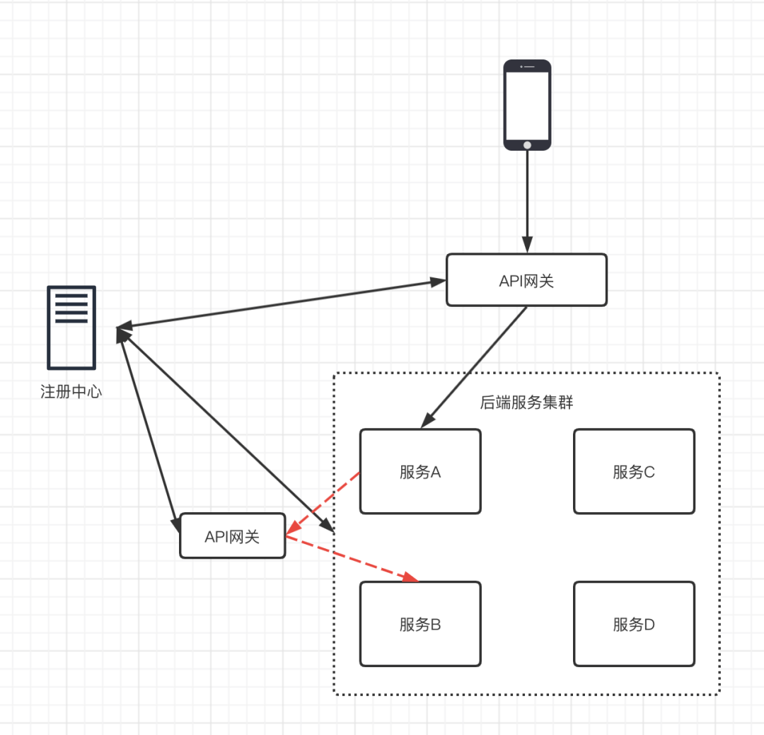 - 后端服务集群间,通过注册中心互相发现对方,而实现直接调用(通常使用Ribbon、Feign这些框架)