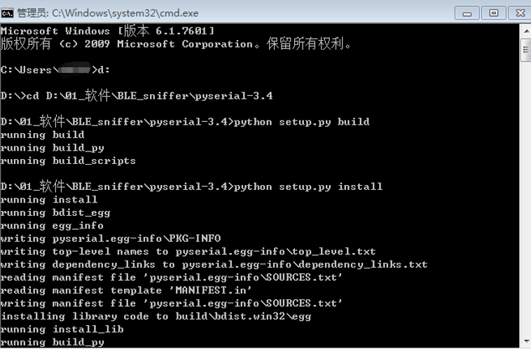 离线安装:解压pyserial-3.4.tar.gz,在控制台进入pyserial-3.4文件夹目录,依次执行命令:“python setup.py build”、“python setup.py install ”即可完成安装。如下图所示。