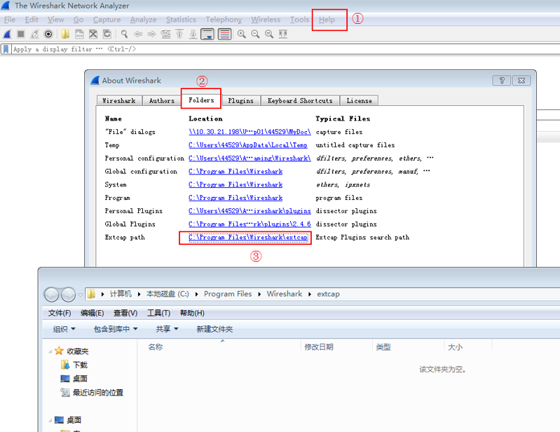 打开Wireshark,点击Help->Folder,然后再点击Extcap path的目录,打开Wireshark的extcap目录,或者直接通过Wireshark安装目录打开也行,如下图所示。