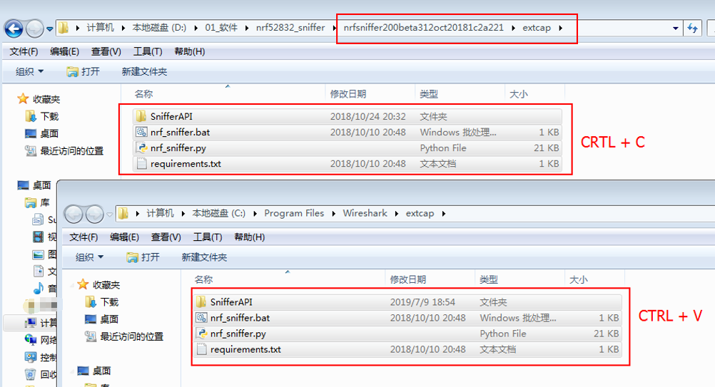 将nrfsniffer200beta312oct20181c2a221下的extcap文件夹中的内容复制到wireshark的extcap文件夹中。
