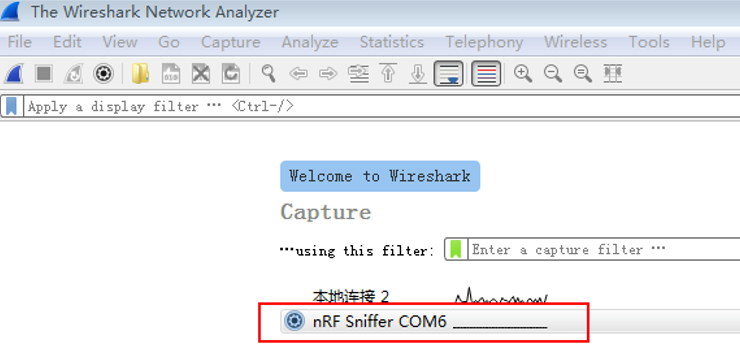 到这里,环境已经搭建好了。接下来关闭Wireshark,插上nrf52832 Sniffer,这里需要安装CP210x驱动,因为这个sniffer实际上是通过USB转TTL芯片CP210x与wireshark通信的,插入sniffer后可以在设备管理器中查看是否驱动是否正常。确保驱动无误后打开Wireshark,点击下图中的nRF Sniffer即可开始抓包,如果没有出现“nRF sniffer COMx”,则可能是串口驱动没有安装正确,或者pyserial没有安装正确。