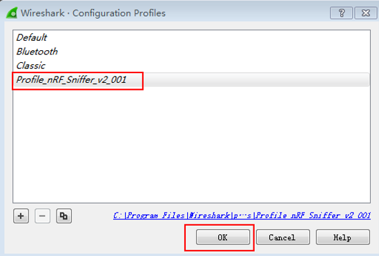 最后,切换协议到之前设置的BLE协议:在Wireshark中点击Edit->Configuration Profiles…,出来以下选项,选择Profile_nRF_Sniffer_V2_001,点击OK完成设置。