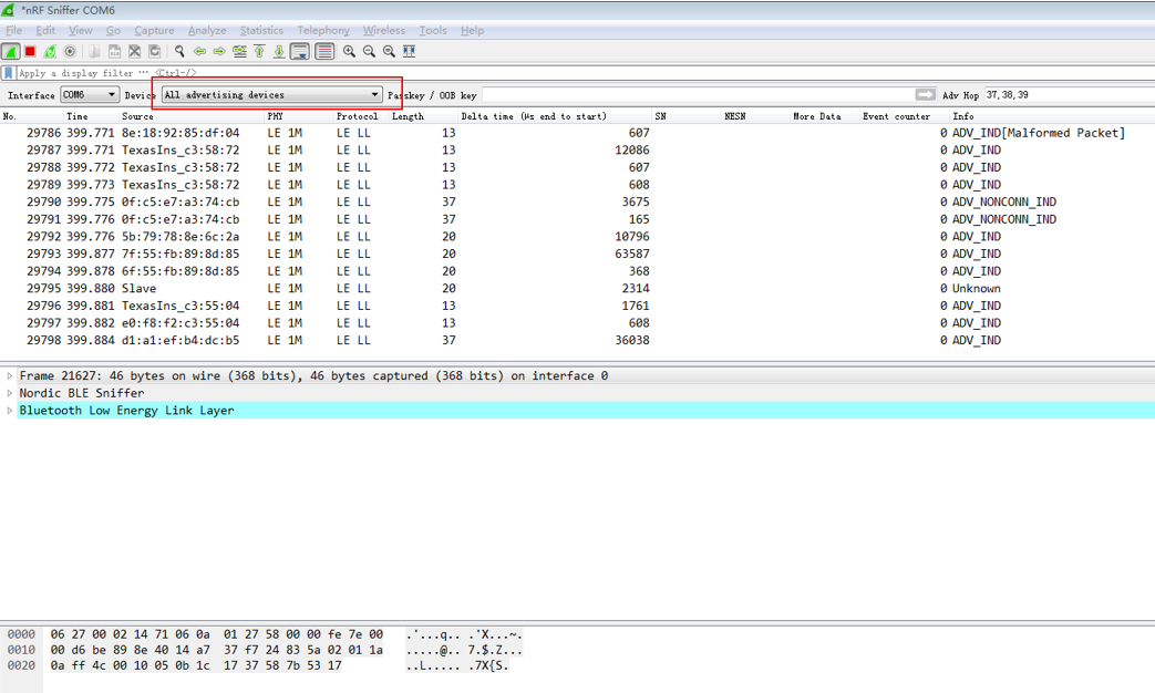 Sniffer默认抓取的是所有的广播包,可以在下图中Device中选择感兴趣的从机MAC地址,这样Sniffer就会只抓取该设备的数据包了。 有时候主机连上从机后,抓包工具就抓不到包了,这可能是抓包工具没有抓到跳频map,导致跟丢(只是猜测)。这时候主机断开重连一次可能就能抓到了。