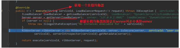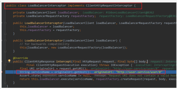 显然有人帮我们根据service名称,获取到了服务实例的ip和端口。它就是LoadBalancerInterceptor