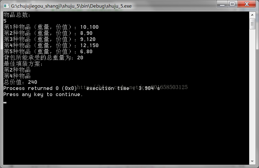 printf("背包所能承受的总重量为:");