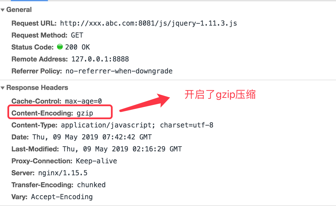 并且我们查看响应头会看到gzip这样的压缩,如下所示
