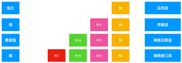 TCP/IP 参考模型包括应用层、传输层、网络互联层和网络接口层。每一层封装的数据包采用不同的名称。