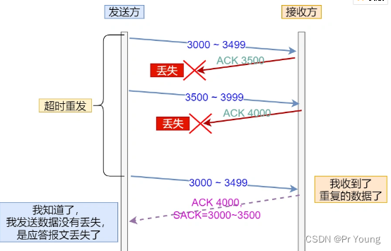 接收方发现这个数据包是重复收到的,回了一个SACK=3000~3499,ACK=4000告诉发送方3000~3499的数据已经被接收成功了,ACK已经到4000了(期待下一个数据包编号是3500开始的)这个SACK就叫DSACK