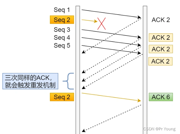 发送端收到了三个 Ack = 2 的确认,知道了 Seq2 还没有收到,就会重传Seq2