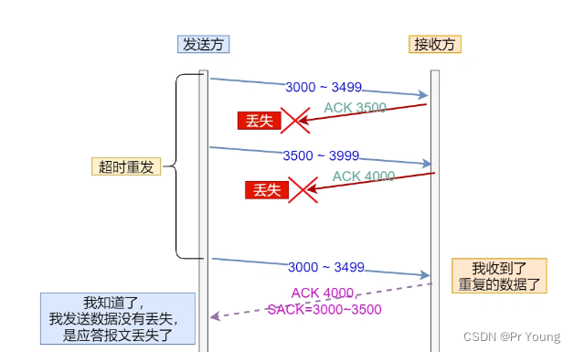 接收方发给发送方的两个 ACK 确认应答都丢失了,所以发送方超时后,重传第一个数据包(3000 ~ 3499)