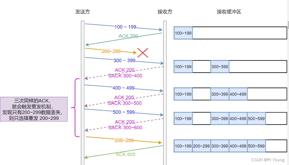 送方收到了三次同样的 ACK 确认报文,于是就会触发快速重发机制,通过 SACK 信息发现只有 200~299 这段数据丢失,则重发时,就只选择了这个 TCP 段进行重复。