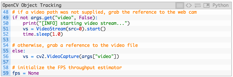 接着--video命令行参数会出现,所以我们可以从视频文件中对视频流进行初始化(55—56行)。