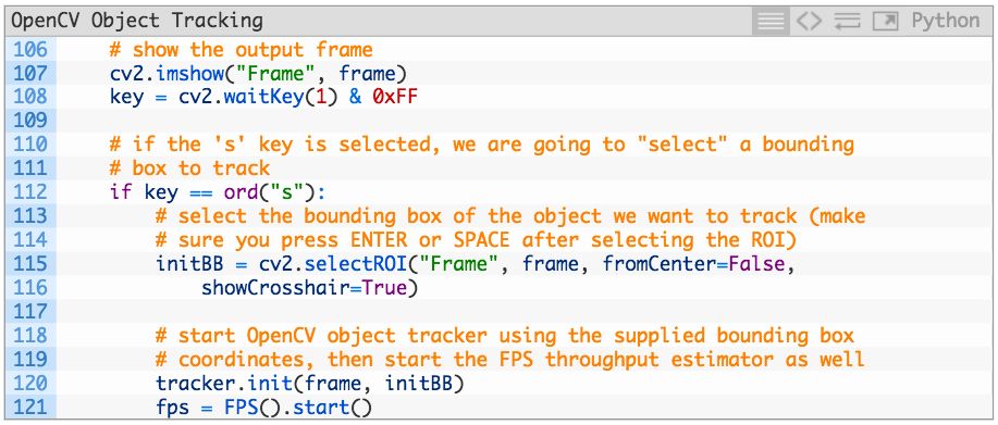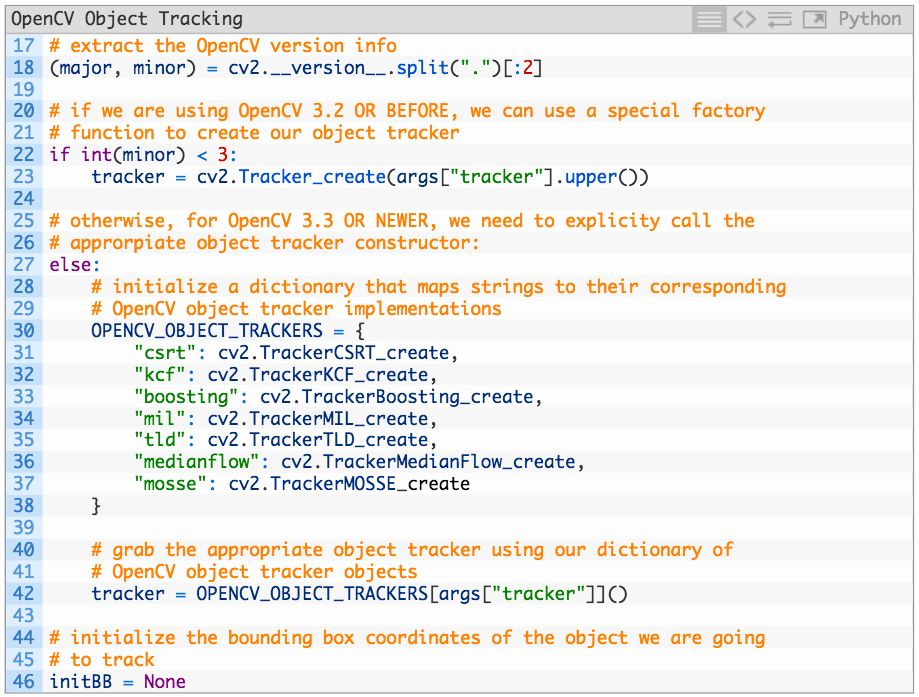图2中我们提到,并不是所有追踪器都使用OpenCV 3以上的版本。在3.3版本上,同样发生了安装上的变化,在3.3之前,追踪器必须用cv2. Tracker_create创造,并且要在追踪器的名字上用大写字符串标注(22和23行)。