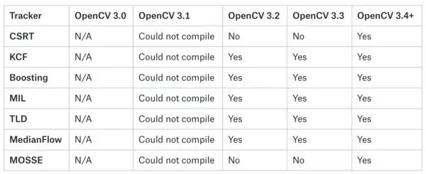 从OpenCV 3开始,目标检测器得到了快速发展,下表总结了不同版本的OpenCV中可食用的追踪器: