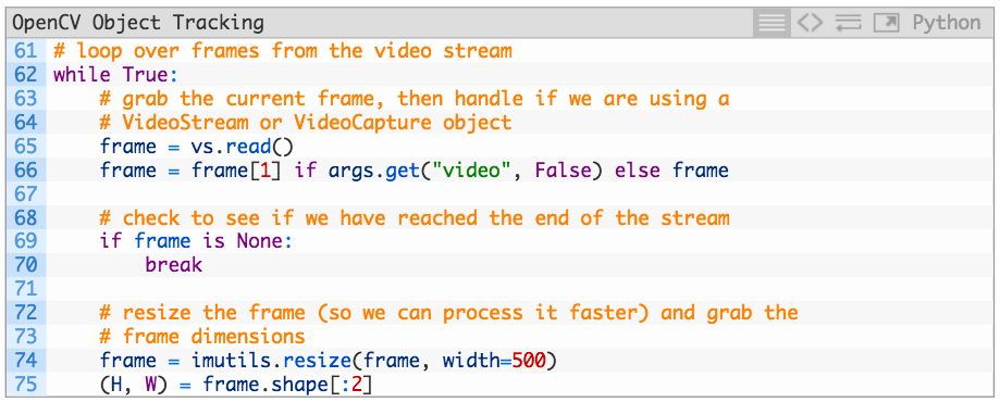 为了让我们的算法处理帧数的速度更快,我们用resize将输入的视频帧调整为50像素(74行),这里处理的数据越少,速度就会越快。