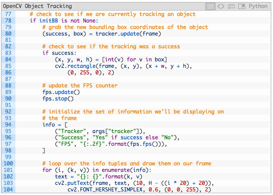 如果目标物体已经被选定,我们需要不断更新目标物体的位置,为了做到这一点,我们在80行使用update方法,它会定位目标物体的新位置并且返回一个success和box值。