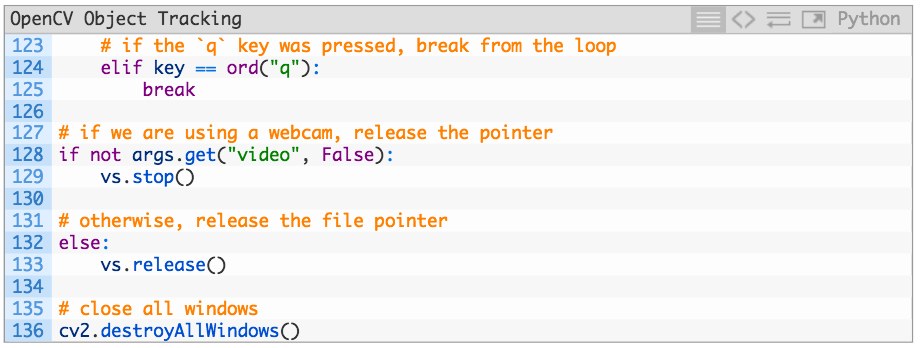 对于3.3以上的版本,每个追踪器可以用各自的函数创造,如cv2. TrackerKCF_create。词典OPENCV_OBJECT_TRACKERS包含了7种OpenCV的目标追踪器(30—38行)。它将目标追踪器的命令行参数字符串映射到实际的OpenCV追踪器函数上。