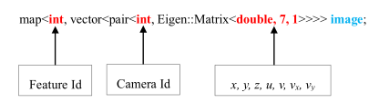 * @param[in] image 某帧所有特征点的[camera_id,[x,y,z,u,v,vx,vy]]s构成的map,索引为feature_id