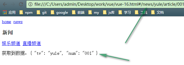 <!DOCTYPE html> <html lang="en"> <head> <meta charset="UTF-8"> <title>Document</title> <script type="text/javascript" src="vue.js"></script> <script type="text/javascript" src="vue-router.min.js"></script> </head> <body> <div id="box"> <!-- 跳转路径 --> <router-link to="/home">home</router-link> <router-link to="/news">news</router-link> <div> <router-view></router-view> </div> </div> <script type="text/javascript"> var News = { template:` <div> <h3>新闻</h3> <router-link to="/news/yule/article/001">娱乐频道</router-link> <router-link to="/news/zhibo/article/002">直播频道</router-link> <div><router-view></router-view></div> </div> ` }; var User = { template: '<p>获取到数据:{{$route.params}}</p>' }; var Home = { template: '<h3>主页</h3>' }; // 配置路由 var jump = [{ path: '/home', component: Home }, { path: '/news', component: News, // 配置子路由 children:[{ // 冒号后面的数据可获取是动态的 path:':tv/article/:num', component:User }] }, { path: '*', redirect: '/home' }]; // 创建实例 var router = new VueRouter({ routes: jump }); // 挂载实例 var app = new Vue({ el: '#box', router: router }) </script> </body> </html>